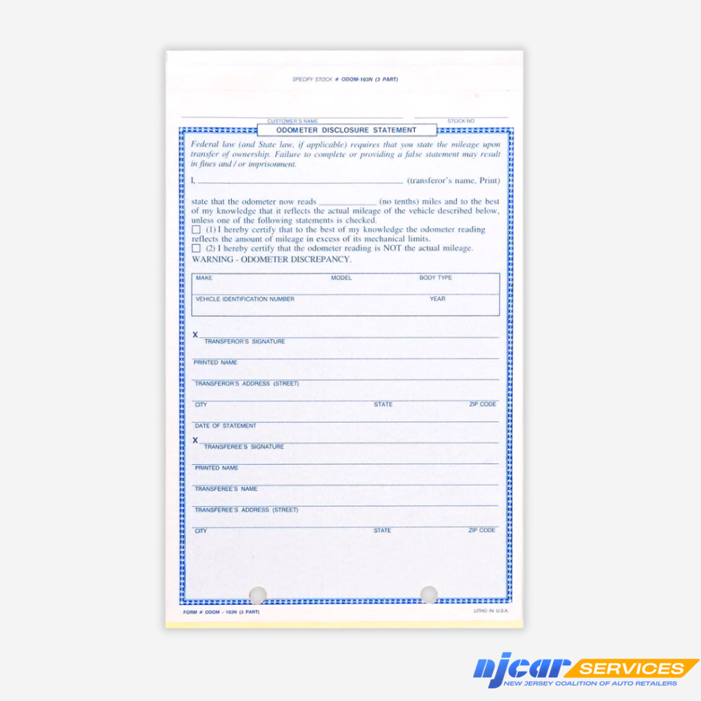 This 3-part odometer disclosure form aligns perfectly in laser and inkjet printers, ensuring hassle-free printing without adjustments. Ideal for vehicle sales and transfers requiring mileage documentation.