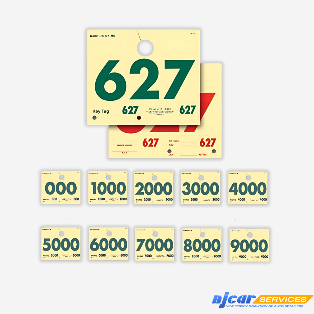 Buff tag paper with red numbers on front and green numbers on back. One inch hole at top. Back portion has service advisor, repair order number, customer, and license information. Sold in packages of 1000.