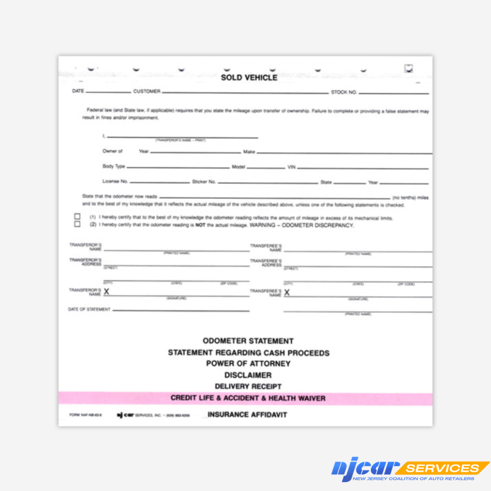 This form has a 2-part odometer statement, statement regarding cash proceeds, power of attorney, disclaimer, delivery receipt, credit life/accident/health waiver and an insurance affidavit.